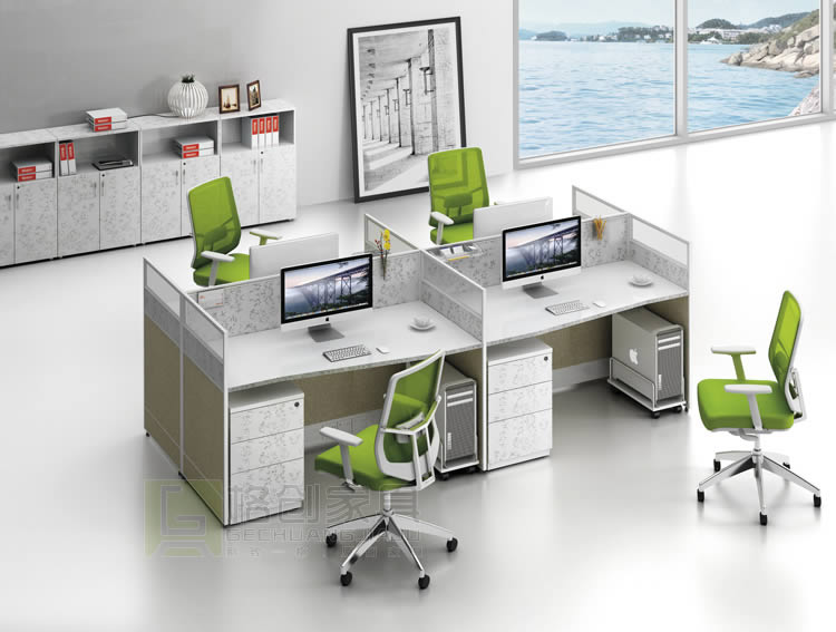 我們來看看第一款定做屏風辦公桌,這款定做屏風辦公桌是四人式的桌椅,兩兩一排,面朝一個方向。兩人之間除了有屏風之外還留有相互交流的空余,讓我們在緊張工作之余能夠與同事探討,交流,共同進步。桌面是弧形設計,線條優美流暢,給繁重的工作帶來輕松愉快的感覺。屏風采用鋁合金框架+磨砂玻璃材料,經濟環保。整個定做屏風辦公桌采用灰色調,顯得沉穩大氣,給人成熟干練的氣息。